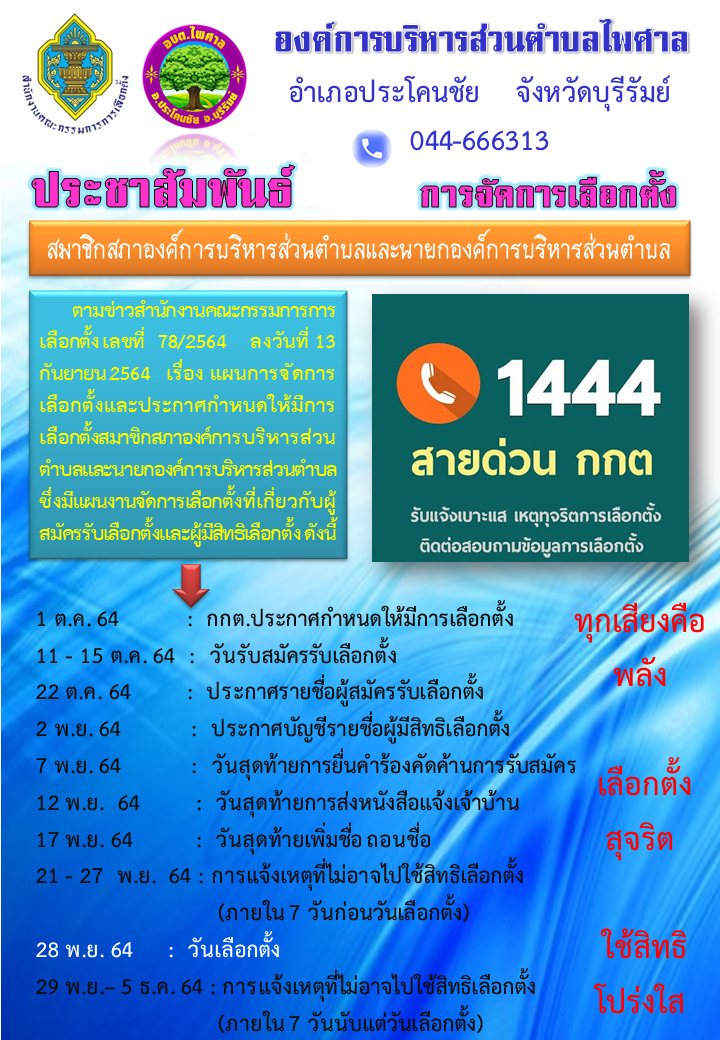 ประชาสัมพันธ์ องค์การบริหารส่วนตำบลไพศาล เรื่อง การจัดการเลือกตั้งและประกาศ กำหนดให้มีการเลือกตั้งสมาชิกสภาองค์การบริหารส่วนตำบลและนายกองค์การบริหารส่วนตำบล