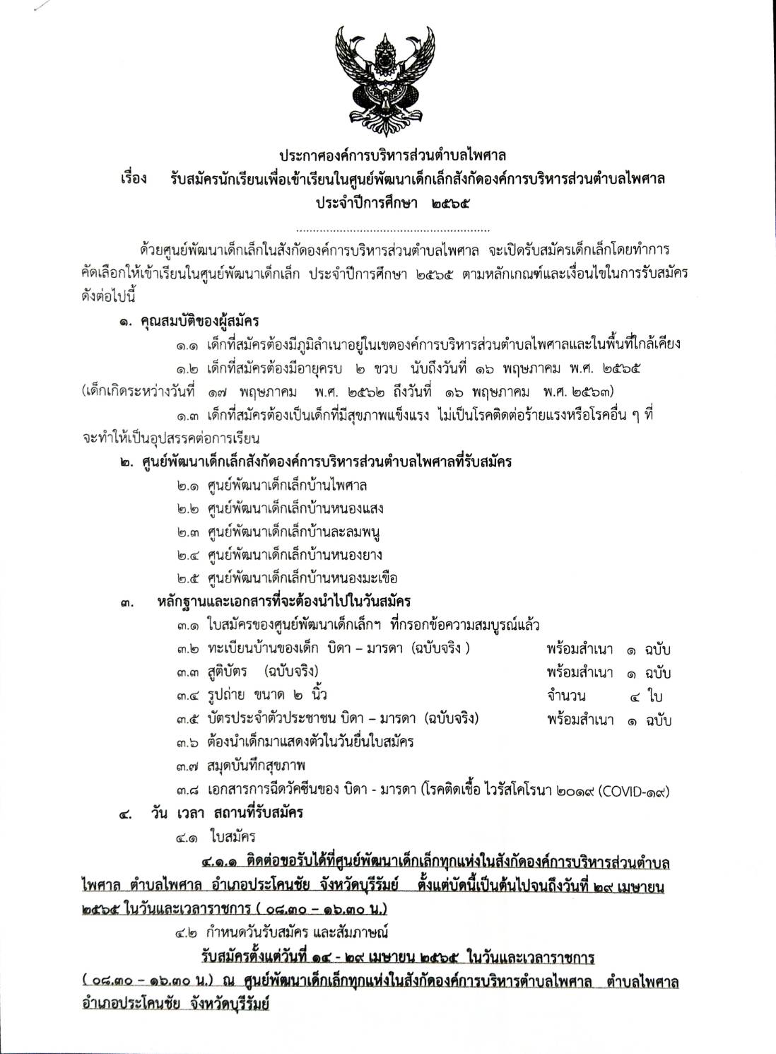 ประชาสัมพันธ์ เรื่อง รับสมัครนักเรียนเพื่อเข้าเรียนในศูนย์พัฒนาเด็กเล็กสังกัดองค์การบริหารส่วนตำบลไพศาล ประจำปีการศึกษา 2565