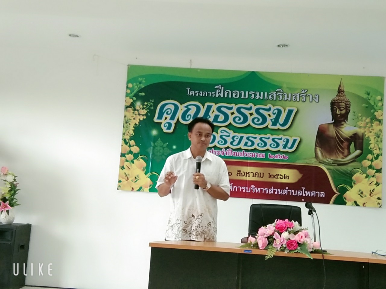 เมื่อวันเสาร์ ที่ 31 สิงหาคม 2562 อบต.ไพศาลจัดอบรมโครงการเสริมสร้างคุณธรรมจริยธรรม ประจำปี 2562 ณ ห้องประชุมองค์การบริหารส่วนตำบลไพศาล