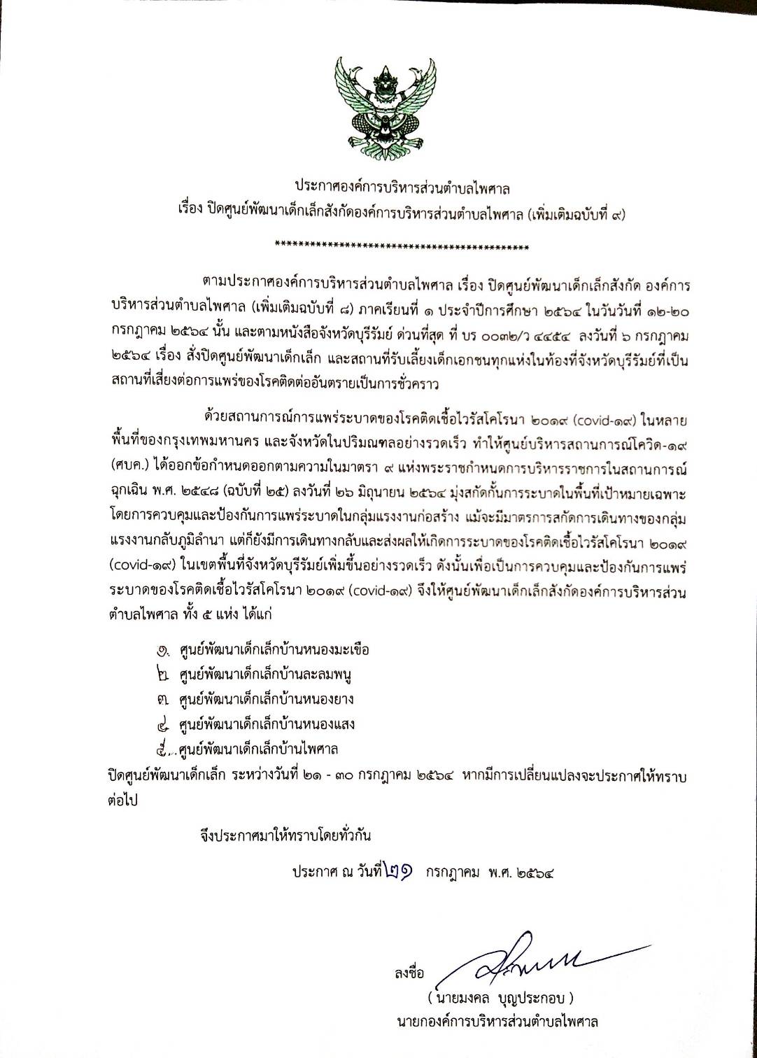 ประชาสัมพันธ์ เรื่อง ปิดศูนย์พัฒนาเด็กเล็กสังกัดองค์การบริหารส่วนตำบลไพศาล (เพิ่มเติมฉบับที่๙) ระหว่างวันที่ ๒๑ – ๓๐ กรกฎาคม ๒๕๖๔