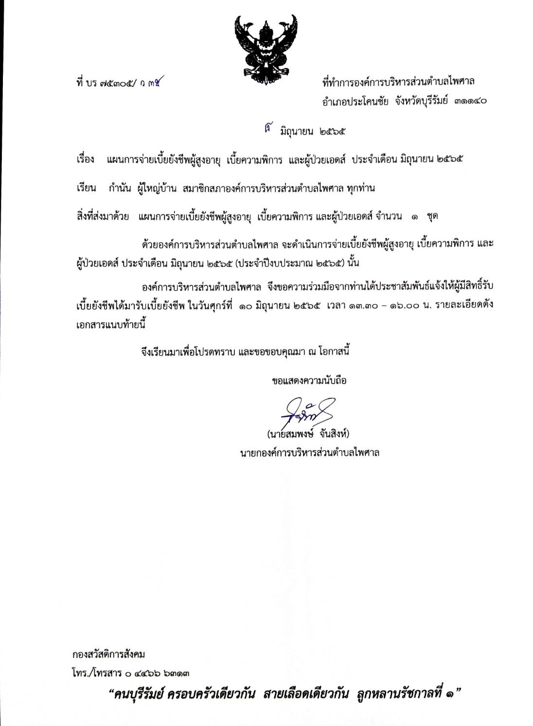 เรื่อง แผนการจ่ายเบี้ยยังชีพผู้สูงอายุ เบี้ยความพิการ และผู้ป่วยเอดส์ ประจำเดือน พฤษภาคม 2565