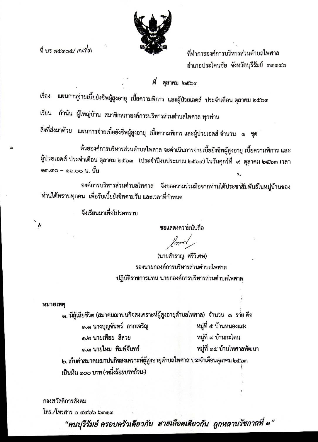 เรื่อง แผนการจ่ายเบี้ยยังชีพผู้สูงอายุ เบี้ยความพิการ และผู้ป่วยเอดส์ ประจำเดือน ตุลาคม ๒๕๖๓ ในวันที่ ๙ ตุลาคม ๒๕๖๓